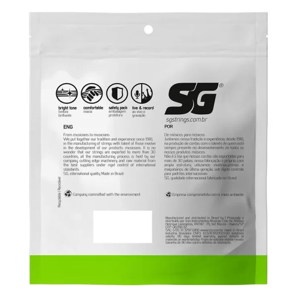 O encordoamento para baixo, tensão Extra Light, fornece um timbre brilhante, agradável e nítido. Ideal para músicos que procuram uma sonoridade mais suave, como por exemplo o Soul, o Jazz e o Pop. Grandes baixistas procuram consistência, conforto e durabilidade, e foi pensando nisso que a SG desenvolveu esta linha de níquel. Trazendo o máximo de conforto com o equilíbrio sonoro que só o níquel da mais alta qualidade pode alcançar, este encordoamento traz um low-end mais profundo, médios dinâmicos e percussivos, agudos brilhantes e durabilidade acima da média. Medidas para uso em escala com comprimento de 34” / 864mm. Revestimento composto de uma, duas ou até três camadas de aço niquelado NPS e núcleo hexagonal de aço estanhado.