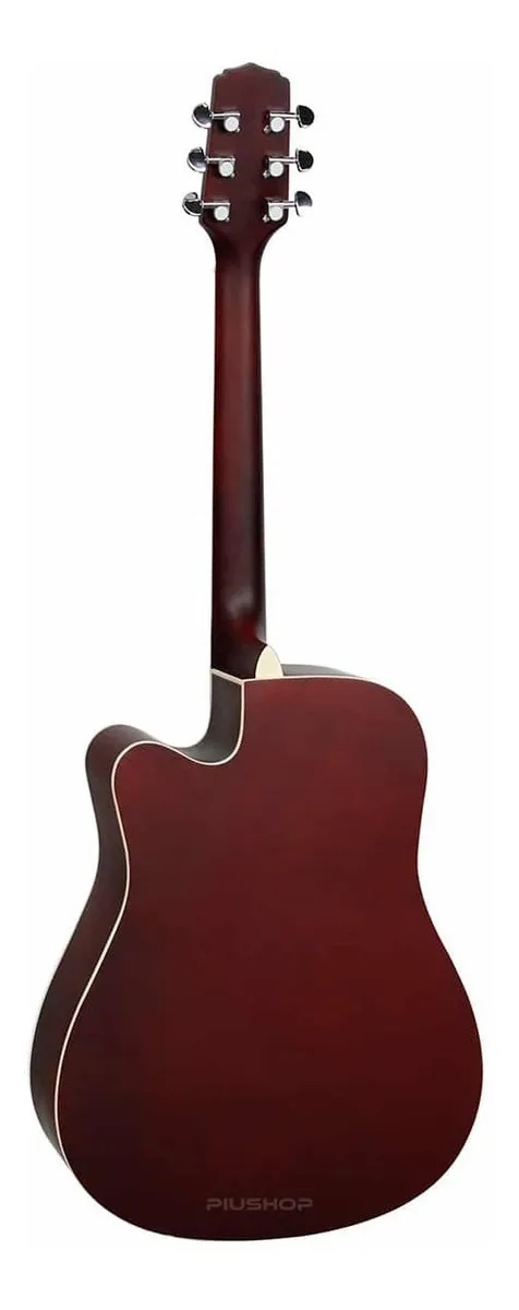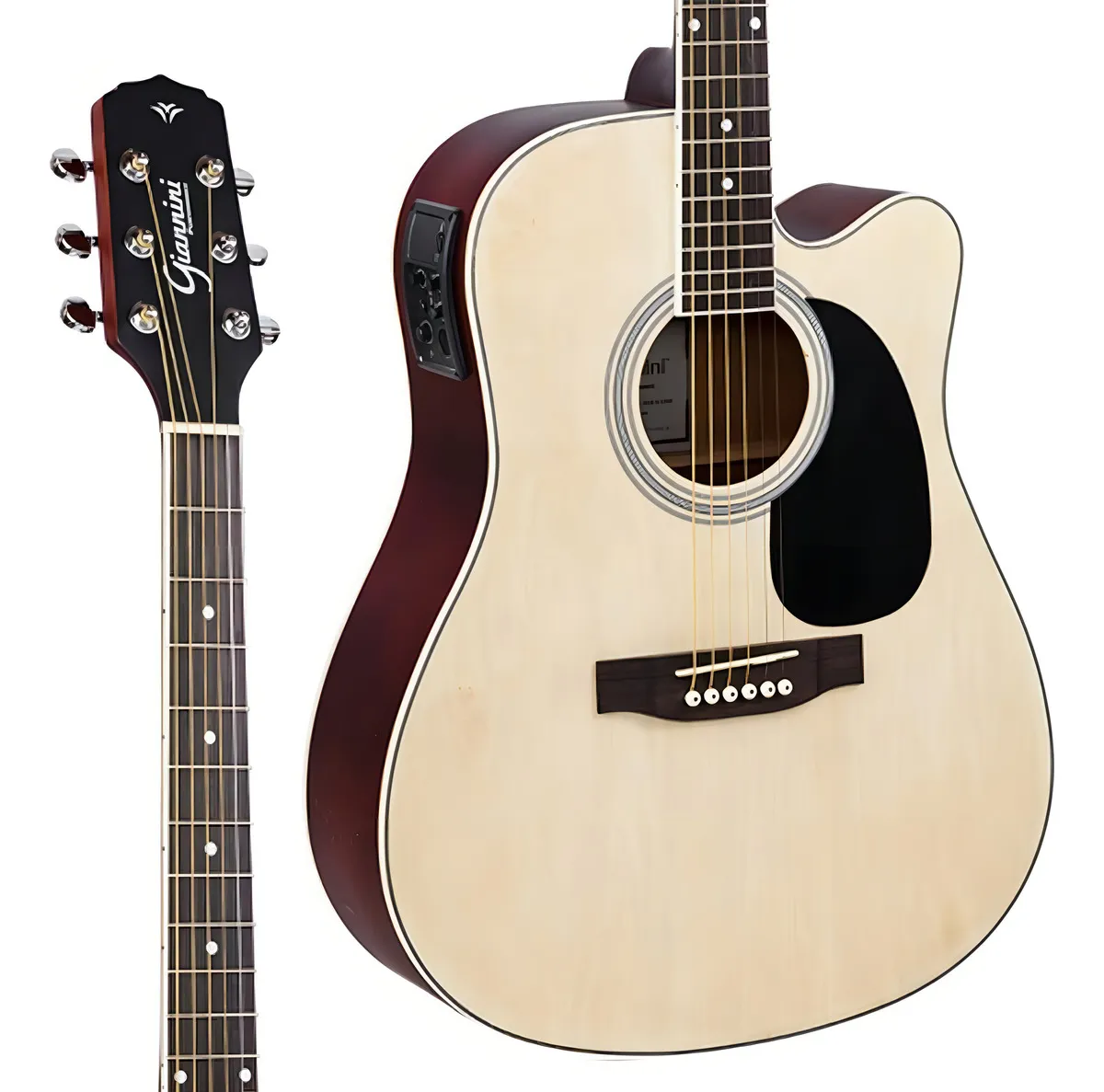 Especificações Origem: China Shape: Dreadnought Cutaway aço eletroacústico Cor: Natural Satin (NS) Tampo: Basswood Lateral e Fundo: Basswood Braço: Okoume Tensor: Bi-direcional Escala: Techwood Comprimento da escala: 648 mm (25,5”) Cavalete: Techwood Tarraxas: Blindadas cromadas 3+3 Pestana: ABS Largura da pestana: 43 mm (1,7”) Rastilho: ABS Largura do rastilho: 72 mm (2,83”) Equalizador: GS-3T, ativo 3 bandas com afinador cromático e saída P-10 Acabamento: Verniz fosco Cordas: Aço, similares à Giannini GEEFLK .011-.052 Headstock: Placa adicional em Basswood Largura da caixa: 400 x 295 mm Altura da caixa: 100 x 120 mm Tamanho total: 104 cm (40,94”)